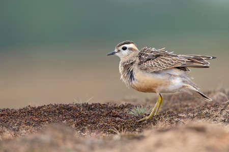 A juvenile Eurasian dotterel (Charadrius morinellus) stretching and preening in the heather of the Netherlands.