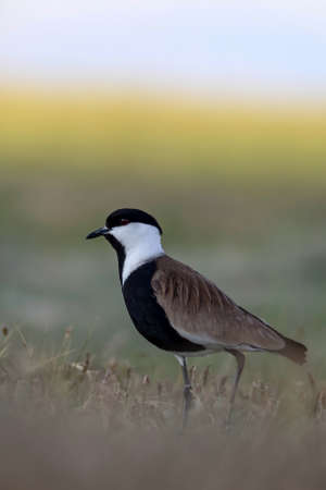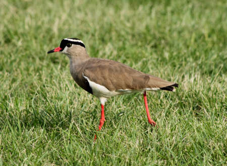 Bright Eyed Crowned Plover Lapwing Bird on Grass with Extended Leg