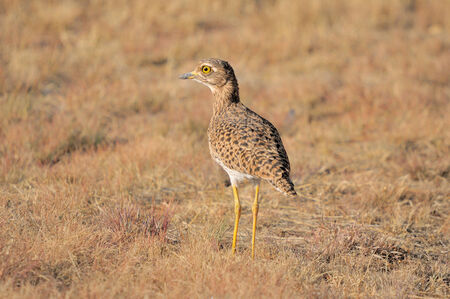 The spotted thick-knee (Burhinus capensis) foraging in the early morning in the savanna.