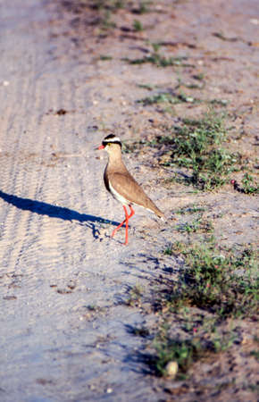 Wattled lapwing standing on a path, showcasing its distinctive features and natural behavior. Emphasizes the bird habitat and posture.