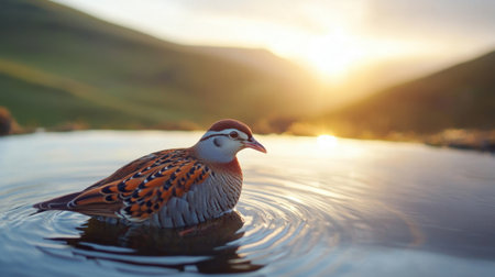 A close-up of a red-legged partridge's beak touching the waters surface as the sun rises over the hills in the background.