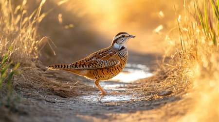 A Northern Bobwhite drinking from a puddle on a dirt path, its feathers shining in the sunlight amidst a field of tall grasses.