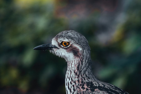 Bush Stone-Curlew or Bush Thick-knee, also known as the Iben Bird Burhinus grallius with blurry background, portrait.