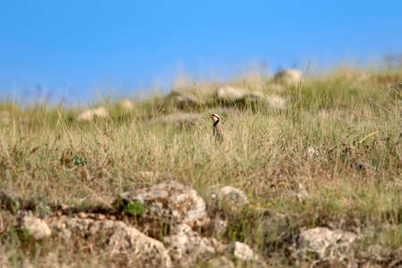 Red-necked partridge (Alectoris ruficollis) perched on a hillside