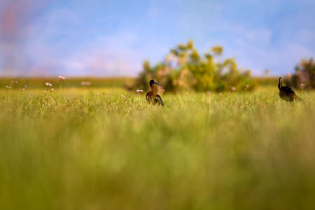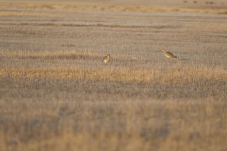 Eurasian curlews Numenius arquata in a meadow.