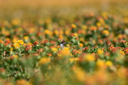 Close-up shot of a small bird in a field of flowers