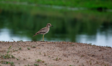 A Grumpy-looking Senegalese Thicknee Burhinus senegalensis standing on the bank