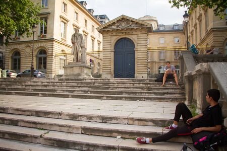 Paris, France - July 7, 2019: Claude Bernard statue in front of the main entrance to the College de France in Paris