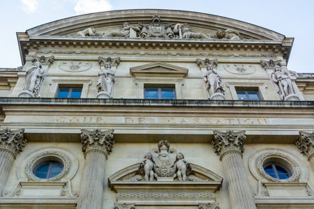 Paris, France – September 30, 2017. Architectural details of the facade of the Court of Cassation building at Palais de Justice in Paris. View with statues and windows.