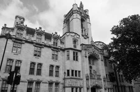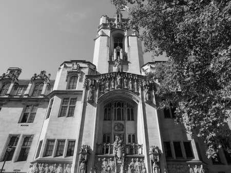 LONDON, UK - CIRCA SEPTEMBER 2019: The Supreme Court of the United Kingdom Middlesex Guildhall in black and white