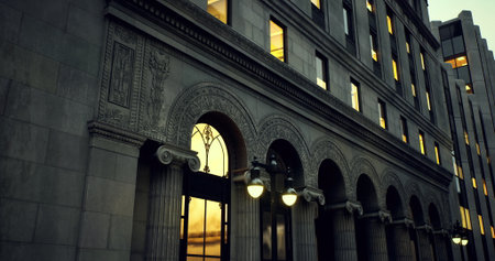 This striking image captures the harmony of classical pillars and modern design, showcasing elegant lines and a warm glow in an urban setting. Perfect for architectural themes.