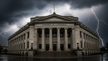 A grand neoclassical Chamber of Commerce building stands under a dark, stormy sky with dramatic lightning strikes...