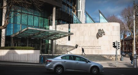 Dublin, Ireland - February 13, 2019: person walking in front of The Criminal Courts of Justice in the city center on a winter day