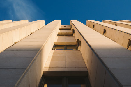 Modern architecture with marble tiled facade, low angle view with selective focus