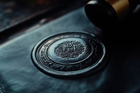 A detailed seal design is pressed into rich, dark leather besides a sophisticated stamping tool, showcasing craftsmanship and artistry.