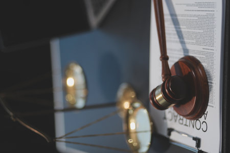 Judge gavel, scales of justice and important agreement in court. Law concept