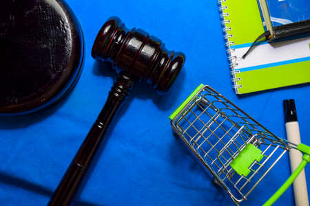 Law, justice concept. Creative artwork table decoration with mallet of the judge on dark foggy background with colorful light. Selective focus