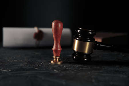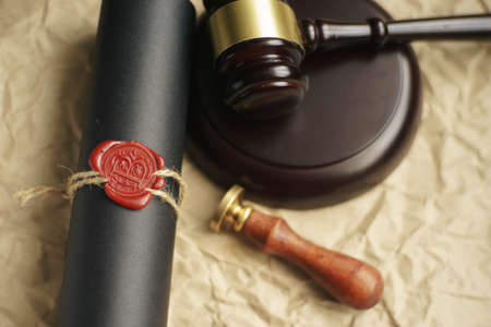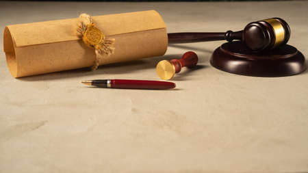 Judge's gavel, old book and parchment scroll with seal and stamp on an old wooden table. law and justice concept