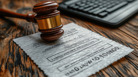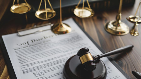 A close-up of a legal document with a gavel and scales of justice, highlighting the symbols of the legal system.