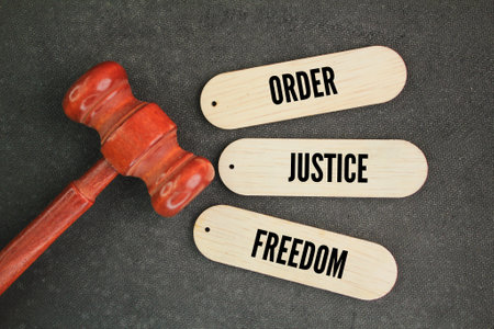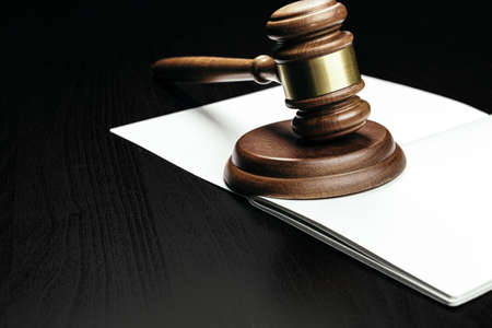 Brown wooden judges gavel on the table in close up. Wooden table, books. Space for text. Law and Justice theme