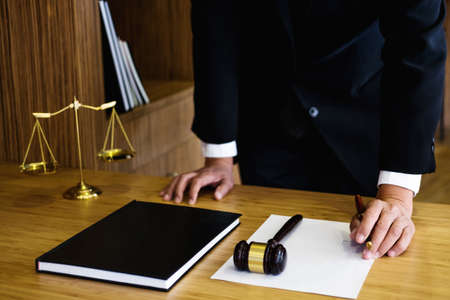 Judge gavel with Justice lawyers, Businessman in suit or lawyer working on a documents. Legal law, advice and justice concept.