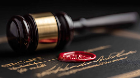A close-up view of a gavel positioned beside a wax seal on a legal document, symbolizing justice and professionalism in the legal and judicial system.