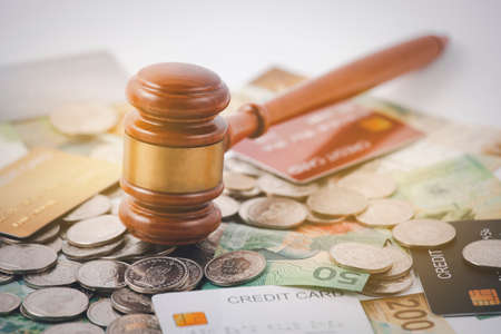 Coins with credit card and Old wood Judge hammer with line graph business connect on white background, Money spending planning, and investment budget, Business saving money concept, Copy space