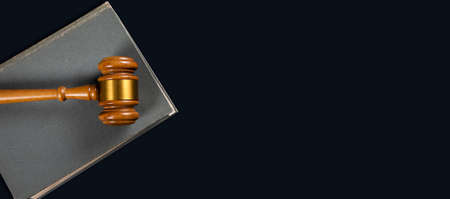 Legal judge hammer or mallet and Law books on black background. Jurisprudence. Laws and justice.