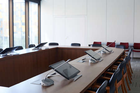 Close-up of microphones in an empty meeting room at a press conference.