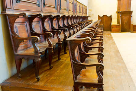 Detail of traditional hard wood courthouse, church choir sitting area. Interior with empty wooden seats