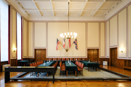 POTSDAM, GERMANY, MARCH 11, 2015: conference room in cecilienhof palace in potsdam, where stalin, churchill (attlee) and truman determined post second world war division of europe.