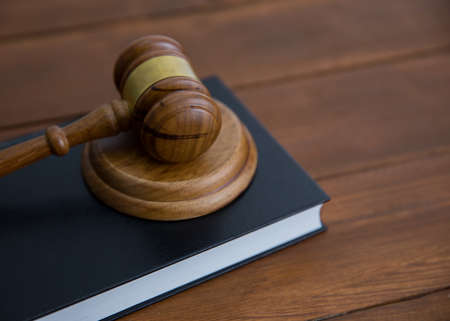 Brown wooden judges gavel on the table in close up. Wooden table, books. Space for text. Law and Justice theme