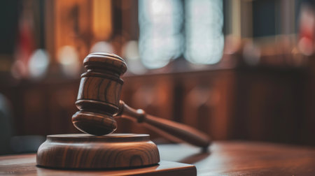 A gavel resting on a wooden block in a courtroom, symbolizing justice and legal authority.