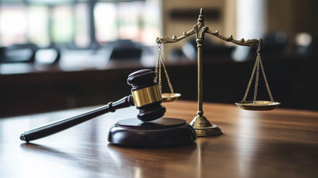 A gavel and a set of scales of justice on a polished wooden desk, symbolizing the balance and fairness of the legal system, with soft lighting creating a serious and professional atmosphere.