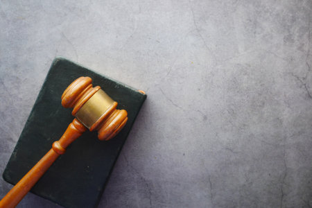Judge gavel near law textbooks in court archive study room for copyright and international legal rights.