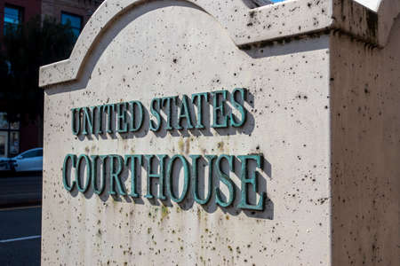 Tacoma, WA USA - circa August 2021: Street view of the United States Courthouse sign outside of Union Station in the downtown area