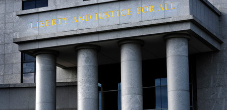 Court building in city with Liberty and Justice written on building