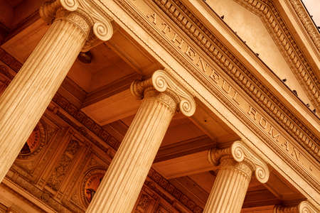 BUCHAREST, circa 2016 - Telephoto detail of The Romanian Athenaeum - Ateneul Roman, in Bucharest, Romania