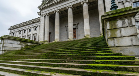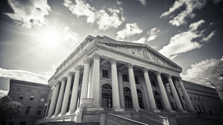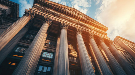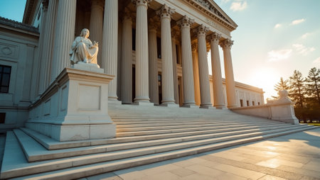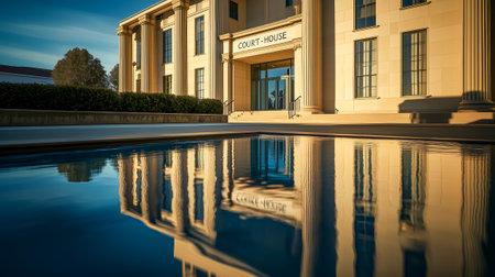 Neoclassical courthouse with grand steps and columns in golden light
