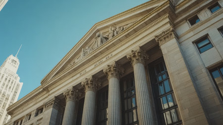 A panoramic view of bank exterior, showcasing its columns and architecture, symbolizing trust and reliability financial services