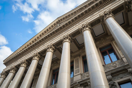 A grand building with detailed columns standing beneath a clear blue sky, Incorporate intricate details such as friezes, pediments, and pilasters into a neoclassical structure