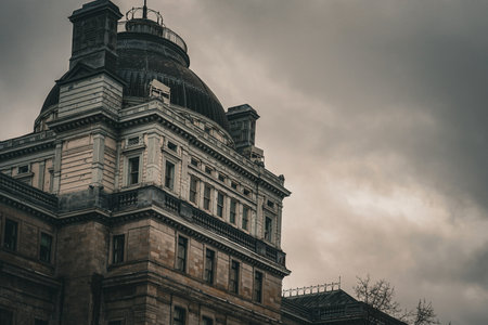 A striking view of classical architecture showcases tall columns under a dramatic sky, representing stability, strength, and historical significance in urban landscapes.