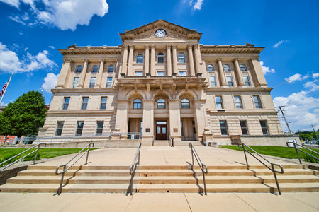 Majestic Kosciusko County Courthouse in Warsaw, Indiana under a clear blue sky, symbolizing tradition and authority.