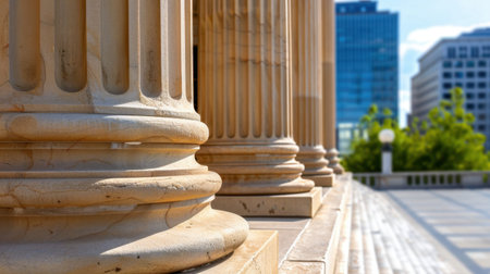 This stunning image showcases the intricate details of elegant columns on a historic building, set against a backdrop of a modern city skyline and a clear blue sky, highlighting the contrast between classic and contemporary architecture.