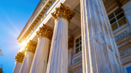 Stunning view of majestic marble columns with ornate golden capitals illuminated by bright sunlight, highlighting architectural beauty and historical significance.