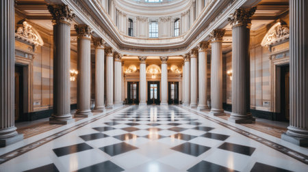 Experience the grandeur of a historic building interior featuring elegant columns and a striking checkerboard floor, showcasing timeless architectural beauty.