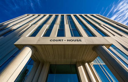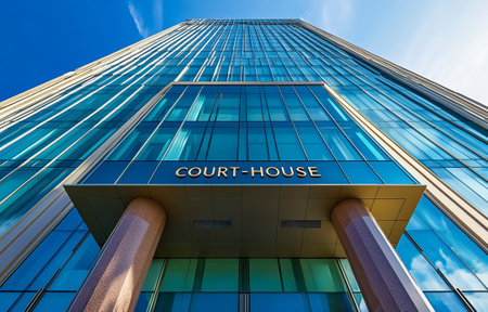 A modern courthouse with a glass facade and prominent columns against a blue sky