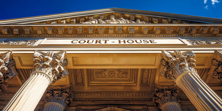 Neoclassical Courthouse Facade with Clock and Columns Low Angle View
