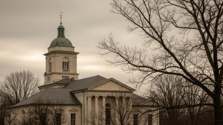 An architectural building with a prominent dome and classical pillars stands under an overcast sky. The image displays the structure's facade alongside bare tree branches. The overall style suggests a historical period, with potential uses in editorial, educational, and design projects.
