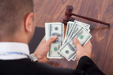 Midsection of corrupt judge hitting dollar bundle on gavel at desk in courtroom